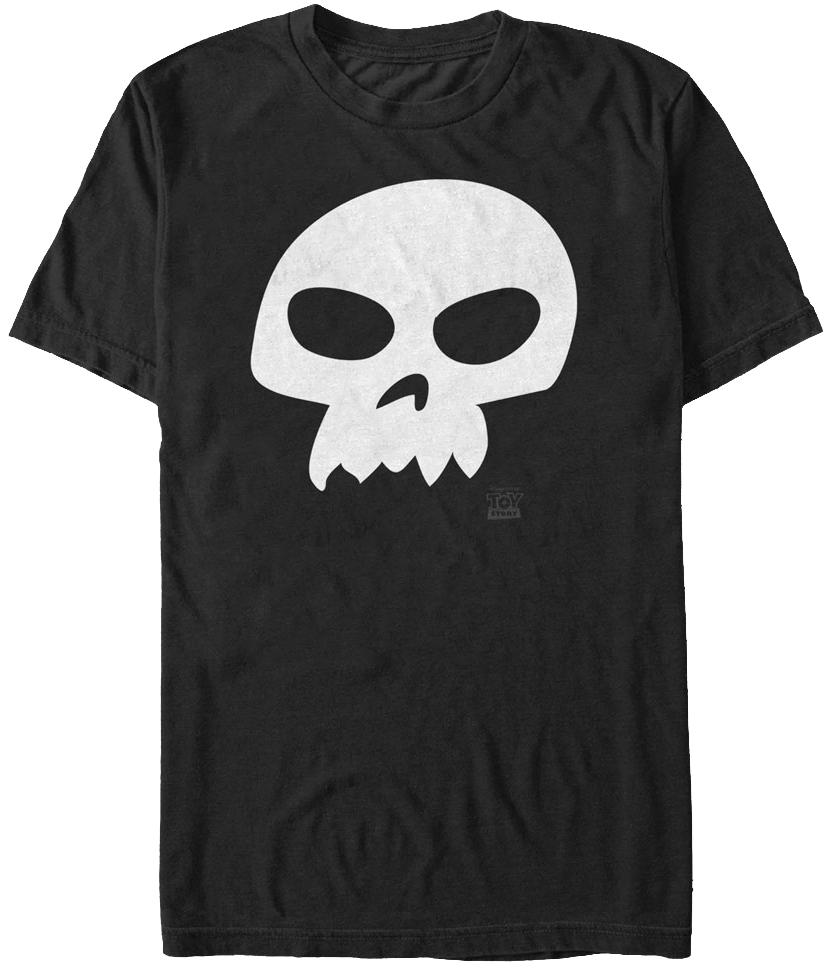 This Toy Story shirt features the skull shirt worn by Andy's neighbor Sid, who was known for torturing innocent toys. This shirt is also seen in Toy Story 3 on an older version of Sid, who grew up to become a garbage collector.