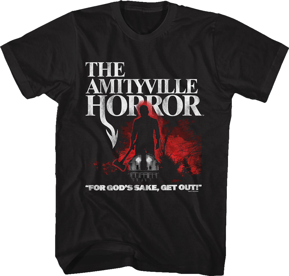 This Amityville Horror t-shirt features a silhouette of George Lutz holding an axe. The shirt includes the movie's tagline, "For God's Sake, Get Out!"