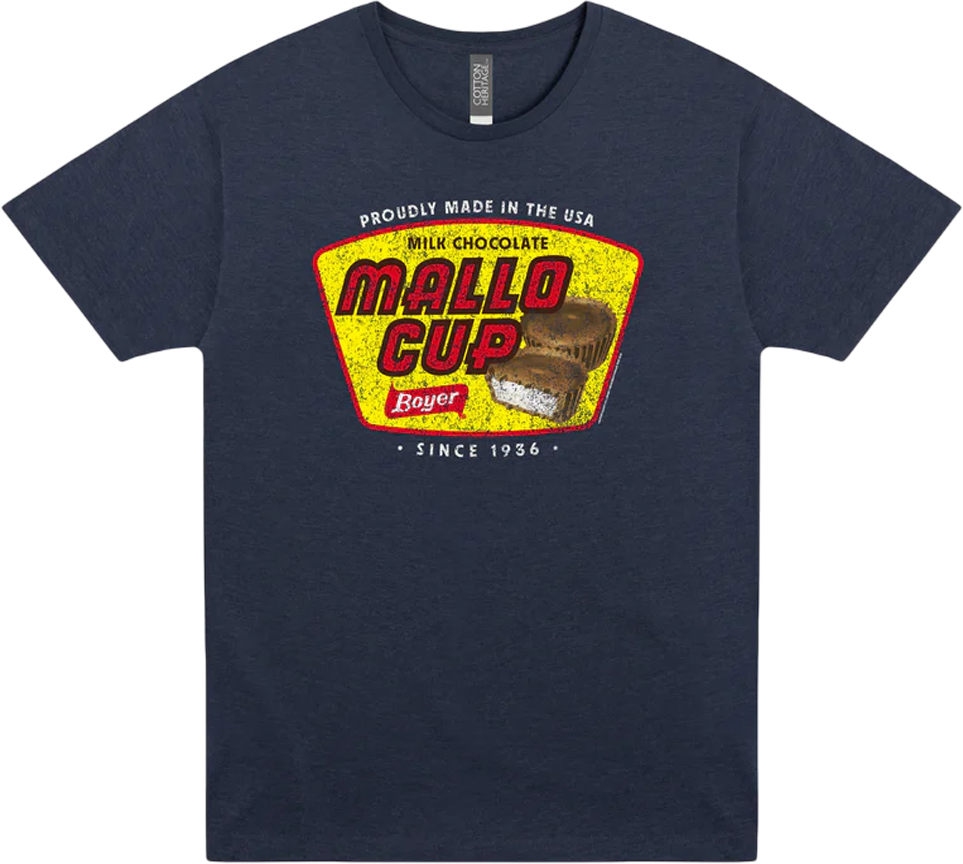 Mallo Cups were introduced in 1936 as the first cup-style candy. They are milk chocolate cups filled with a whipped marshmallow creme center and topped with a sprinkling of coconut flakes inside the chocolate for extra texture and flavor. Everyone will immediately know you are a fan when you wear this Since 1936 Mallo Cup Boyer T-Shirt!