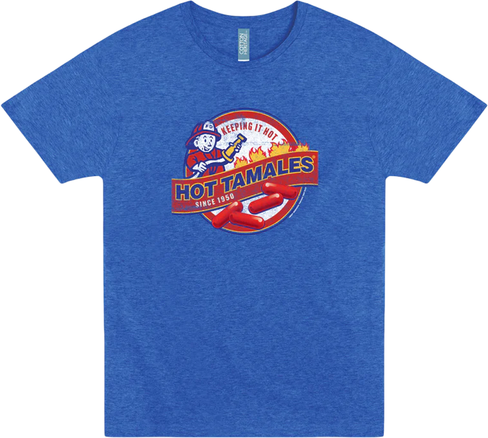 This Hot Tamales t-shirt shows a firefighter ready to put out the heat brought on by the delicious candy. The shirt reads Keeping It Hot Since 1950.
