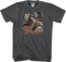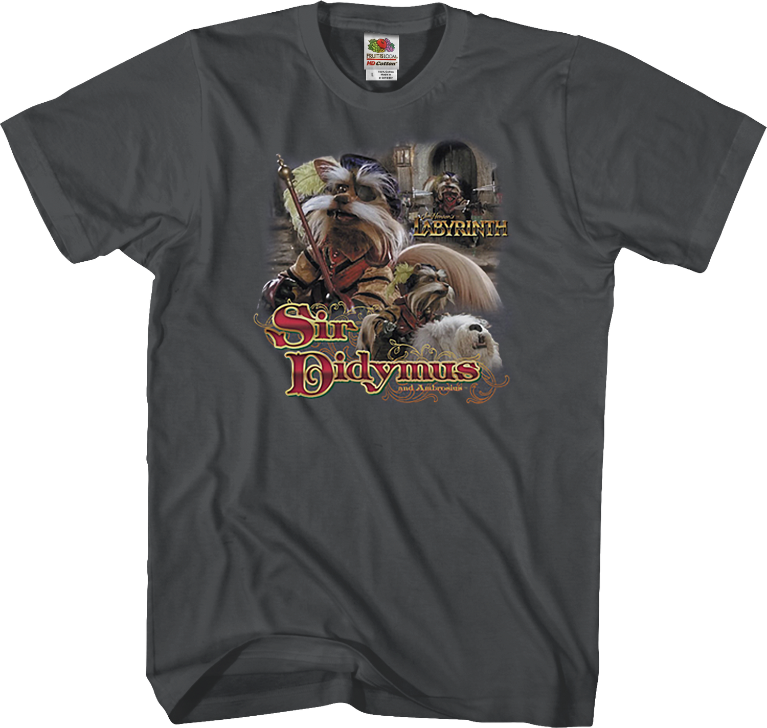 This Labyrinth t-shirt features a collage of photos of Sir Didymus, along with Ambrosius. In the movie, Sarah first encounters Sir Didymous when attempting to leave The Bog of Eternal Stench. Presumably a fox-terrier, the heroic knight is often found riding on the back of Ambrosius the sheepdog.