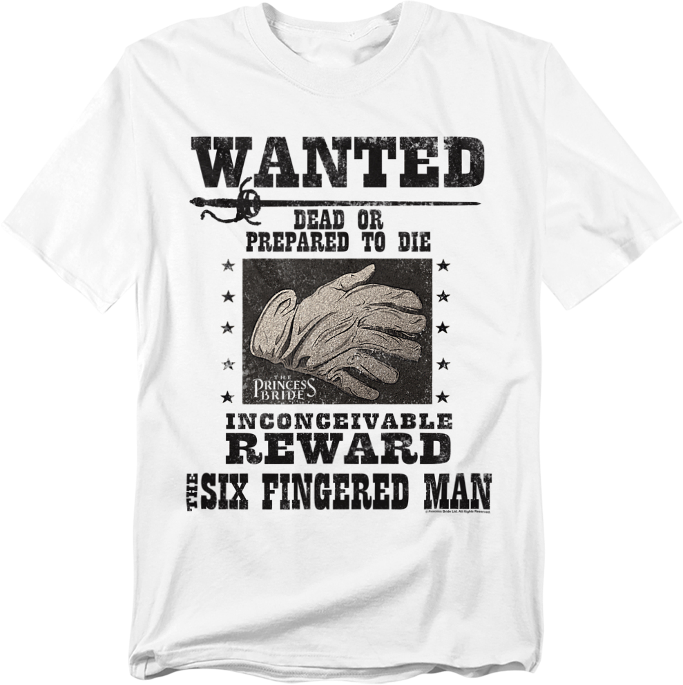 This Princess Bride t-shirt shows Count Rugen's six-fingered glove on a wanted poster. The poster reads "Wanted Dead Or Prepare To Die" and "Inconceivable Reward".