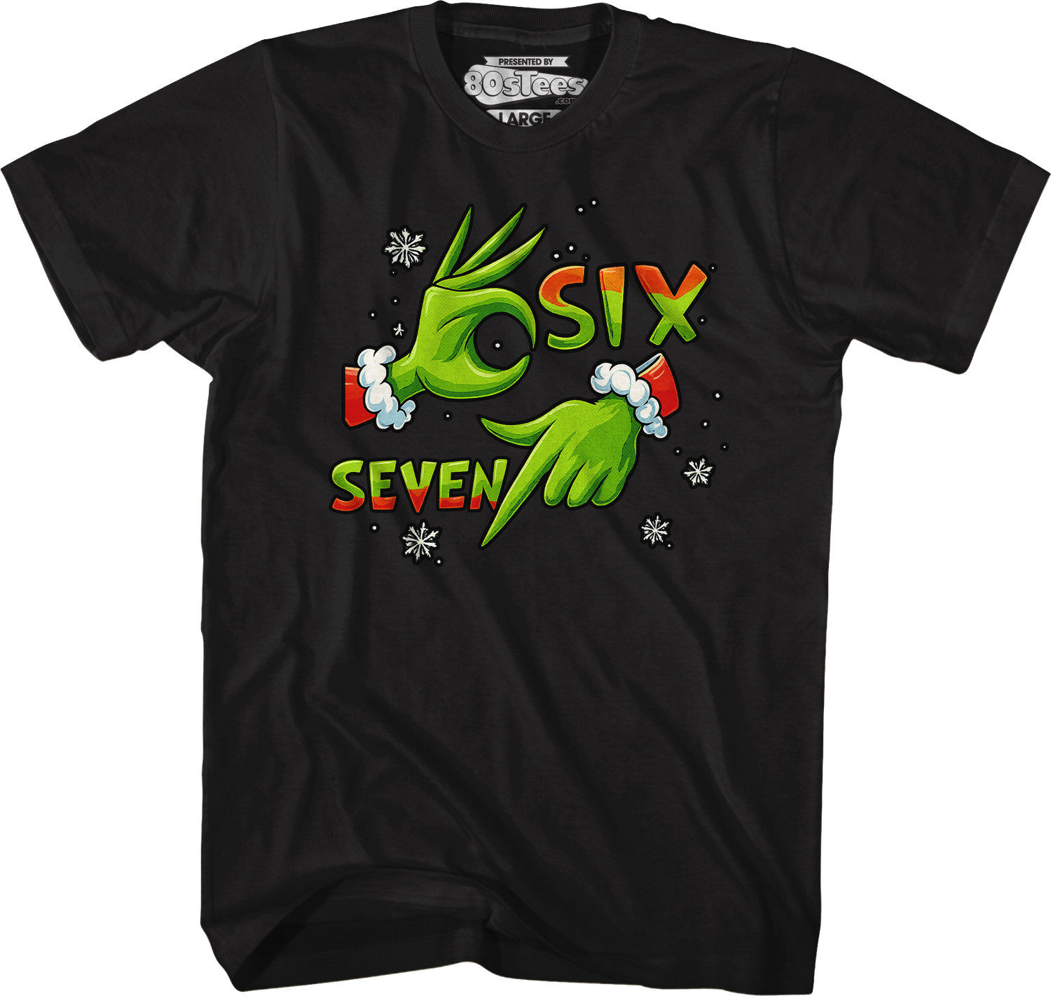 This 80sTees.com exclusive t-shirt shows snowflakes surrounding the Grinch's hands as his fingers make the shapes of the numbers six seven.