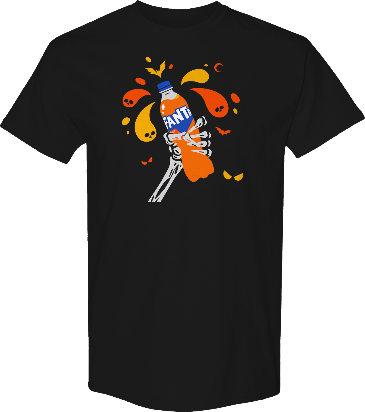 This Fanta t-shirt shows a skeleton's hand gripping a bottle of Fanta. The hand is surrounded by ghosts, bats, and spooky eyes.