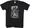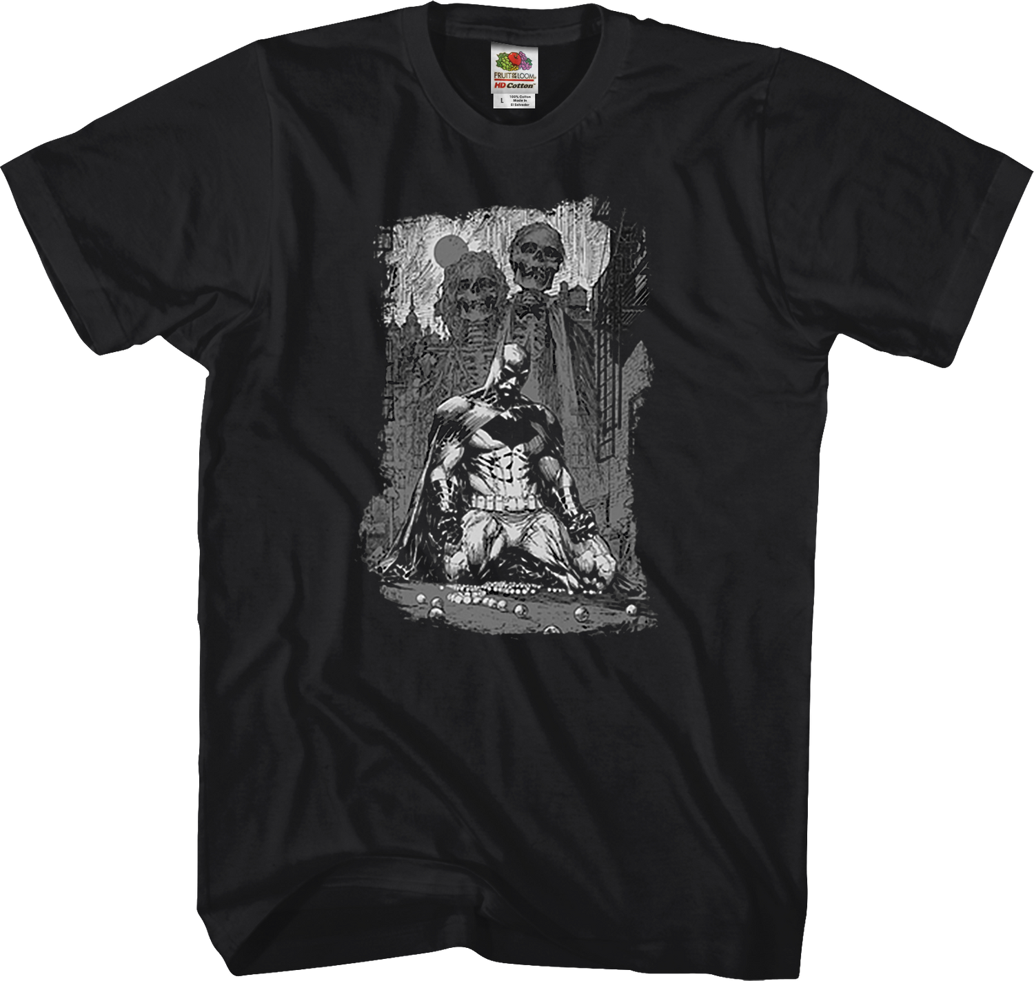Bruce Wayne's alter ego is shown kneeling in the streets on this black and white Skeletons Batman T-Shirt. His mother's string of pearls lies scattered on the ground and the skeletons of his parents loom behind him in the buildings of Gotham. His dark history served to create one of the most iconic heroes on the pages of DC Comics.