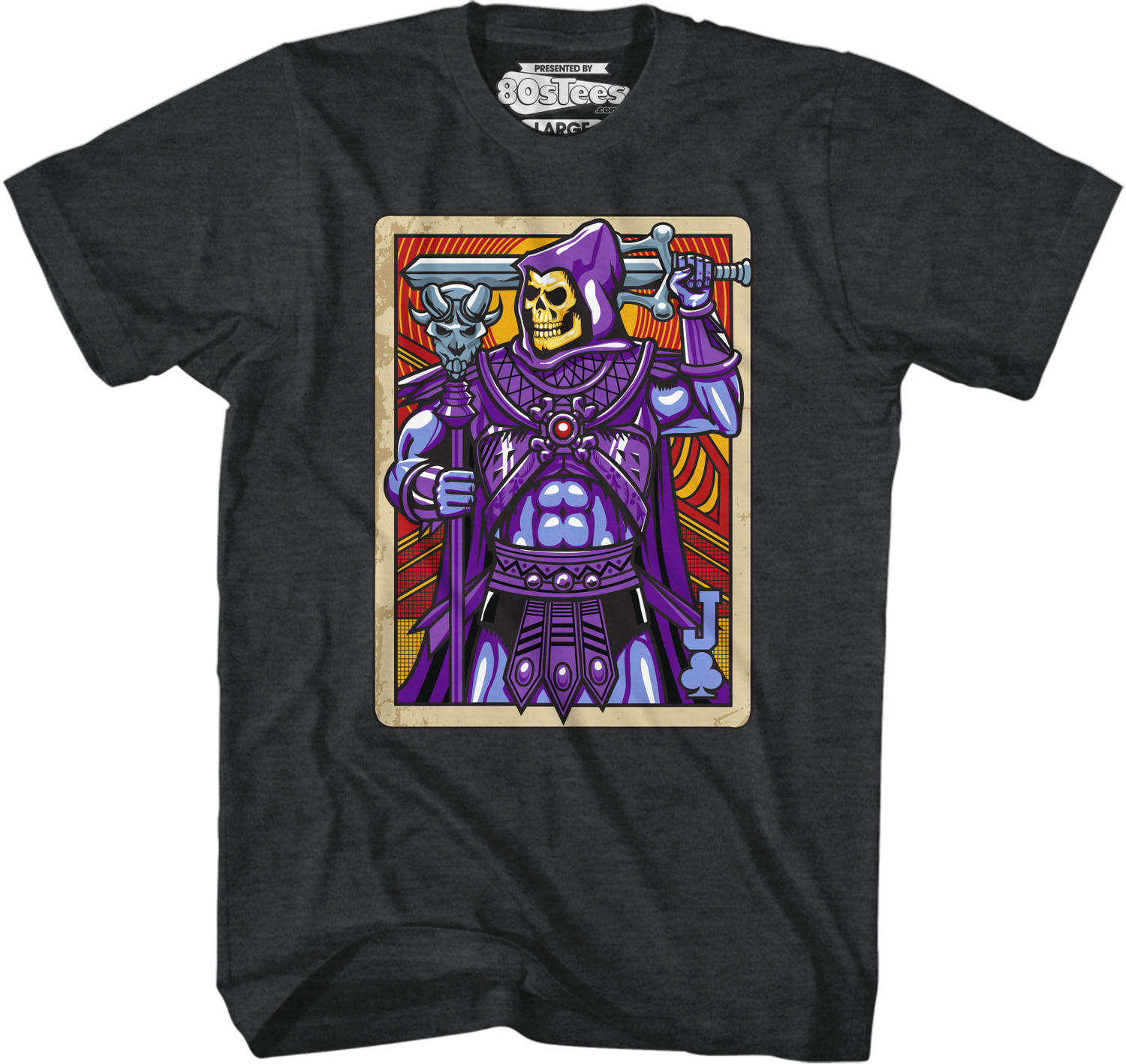 Skeletor certainly has a the laugh of a joker, and this 80sTees.com Masters of the Universe t-shirt shows what the Evil Warrior would look like on a Joker playing card. The demon from another dimension is instantly recognizable on this playing card, with his grinning yellow skull, blue skin, purple battle attire, sword, and menacing Havoc Staff. This is a playing card that is not nice, is not kind, but is absolutely wonderful. For any fan of the wild card of Snake Mountain, this Skeletor Joker Playing Card t-shirt is a must have!