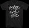 This Slash t-shirt shows a sketch of a skull resting on crossbones while smoking a cigarette, wearing a Slash's top hat, and positioned above a banner that reads R&FN'R.