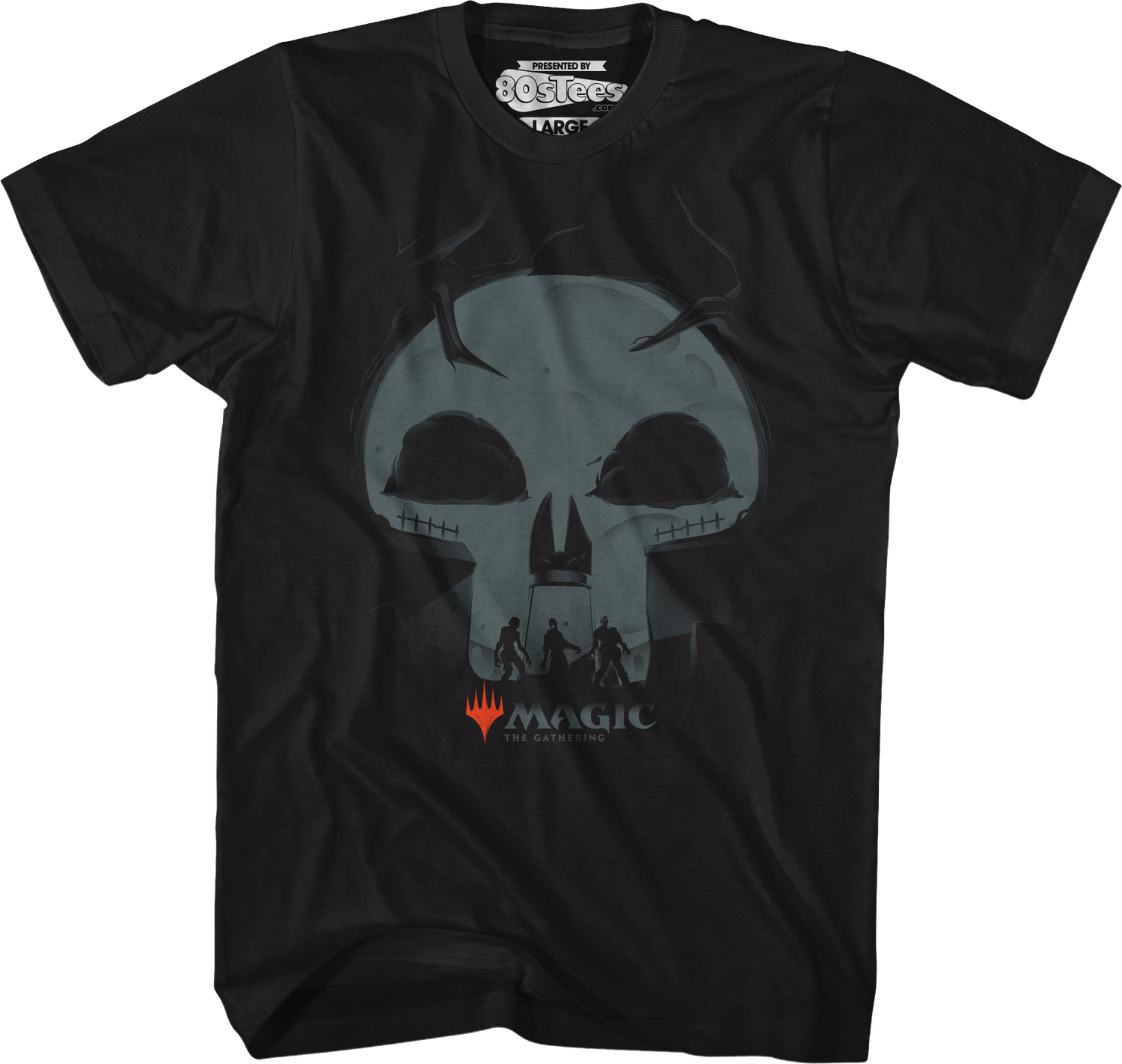 Black is one of the five colors of mana in Magic: The Gathering. It is drawn from the power of swamps and embodies the principles of parasitism and amorality. Seek power through ruthlessness and opportunity when you wear this 80sTees.com exclusive Skull Symbol Magic The Gathering T-Shirt!