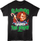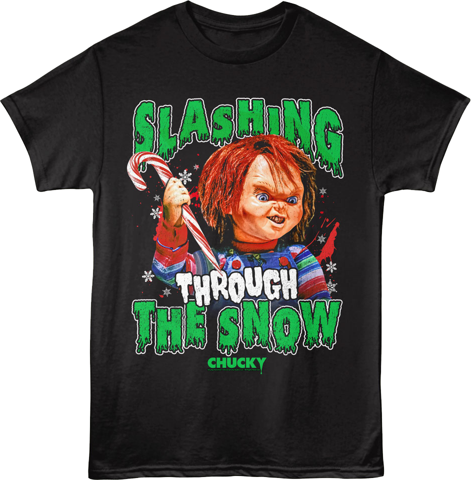 This Child's Play t-shirt shows Chucky surrounded by snowflakes and ready to attack his next victim with a sharpened candy cane. The shirt reads Slashing Through The Snow.