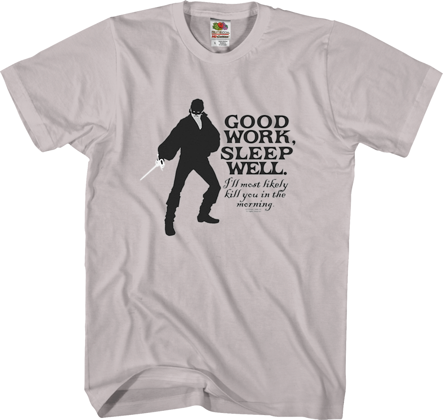 This Princess Bride t-shirt shows an image of Dread Pirate Roberts and the quote that he would say to Westley each night aboard the pirate's ship.