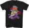 This Poison t-shirt features an image of a skull smoking. The skull is wearing a top hat and is surrounded by roses. The skull is placed on a banner that shows the name Poison.