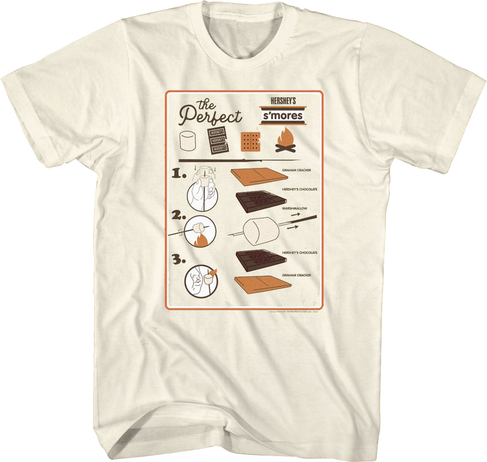 A S'more is a campfire treat consisting of a marshmallow and a layer of Hershey's chocolate placed between two pieces of graham cracker. This t-shirt features step-by-step directions for making the perfect S'more.
