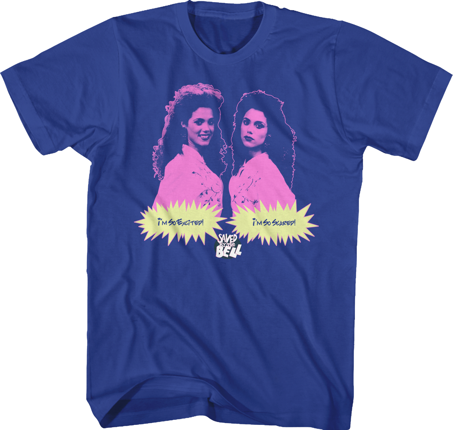 This So Excited So Scared Saved By The Bell T-Shirt features two images of Elizabeth Berkley as Jessie Spano. The lines "I'm so excited" and "I'm so scared" come from the episode "Jessie's Song", in which she takes caffeine pills to cope with the demands of midterms and her singing group. When Zack finds out and confronts her, Jessie hilariously has a breakdown in the quintessential over-acted teen drama scene.
