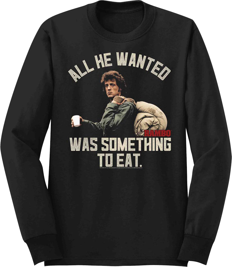John Rambo is consistently regarded as one of the greatest action characters of all time, and now you can show that you are a fan with this Something To Eat Rambo Long Sleeve Shirt!