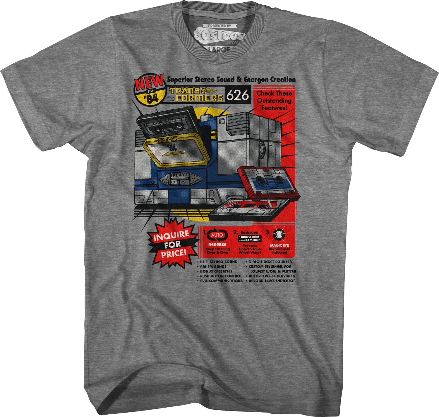 Soundwave is simply one of the most recognizable and popular Transformers of all time. Everyone will know you are a fan when you wear this 80sTees.com exclusive Soundwave Stereo Cassette Transformers T-Shirt!