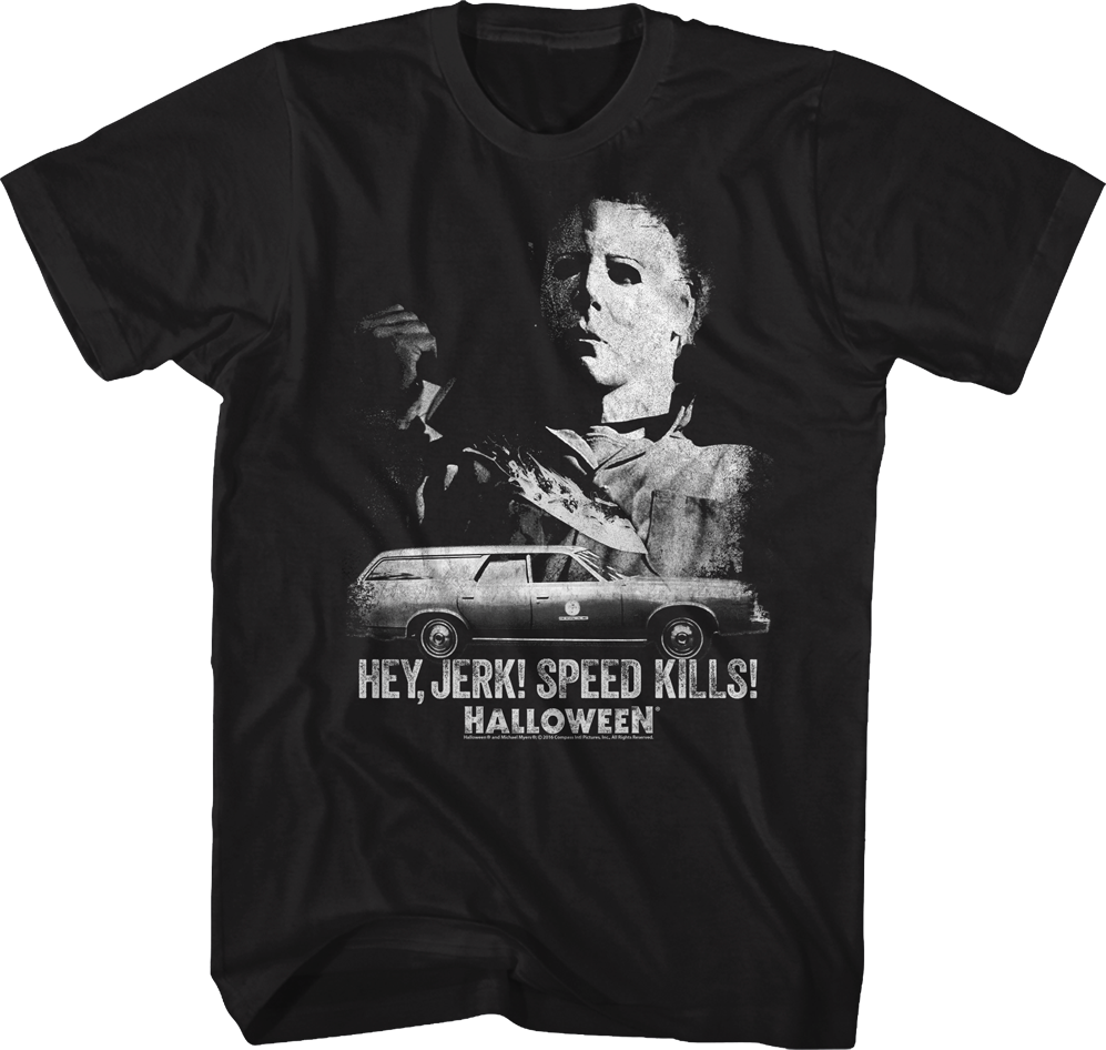This Speed Kills Halloween T-Shirt shows Michael Myers with his instantly recognizable mask and butcher knife. Laurie Strode and her friends saw the car on this shirt passing by on their way home from school. Annie ironically shouts, "Hey, jerk! Speed kills!" as the car passes them on the street. The 1978 film began the horrifying story that has become one of the most famous horror movies of all time.