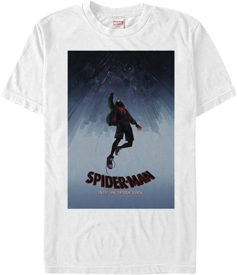 This Spider-Man t-shirt features the poster artwork for the 2018 animated movie Spider-Man: Into the Spider-Verse.