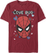 This Spider-Man t-shirt shows Spidey's iconic mask surrounded by hearts. The shirt reads Love Bug.