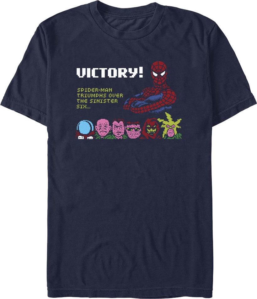 This Spider-Man t-shirt shows Spidey victorious over The Sinister Six in the 1992 video game Spider-Man: Return of the Sinister Six.