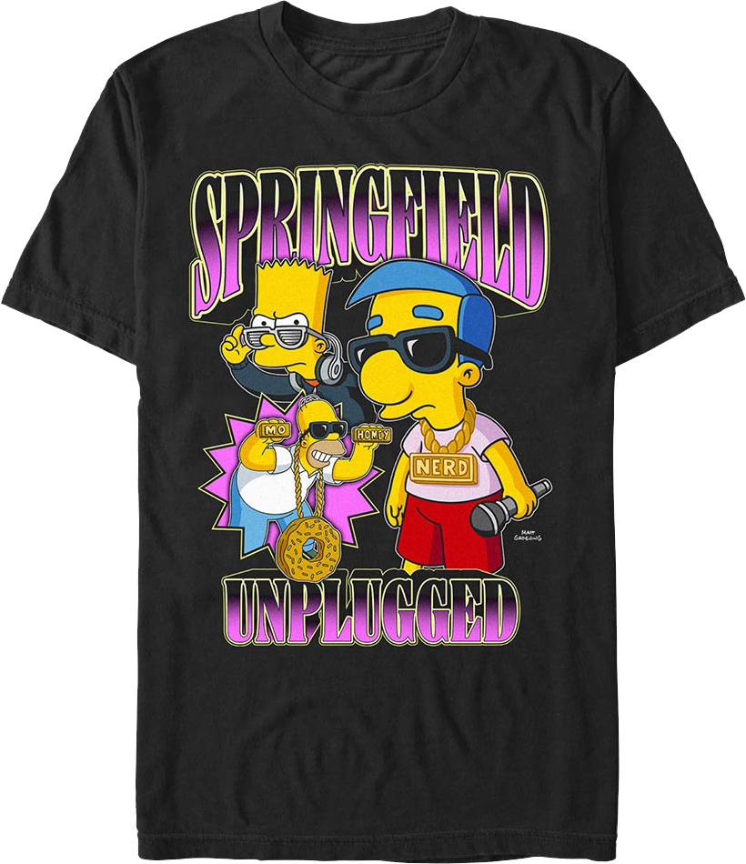 This Simpsons t-shirt shows Bart Simpson wearing sunglasses and a DJ's headphones, Homer Simpson wearing "Mo Homey" knuckle rings and a gold donut necklace, Milhouse Van Houten holding a microphone and wearing sunglasses and a "Nerd" gold necklace. The shirt reads Springfield Unplugged.