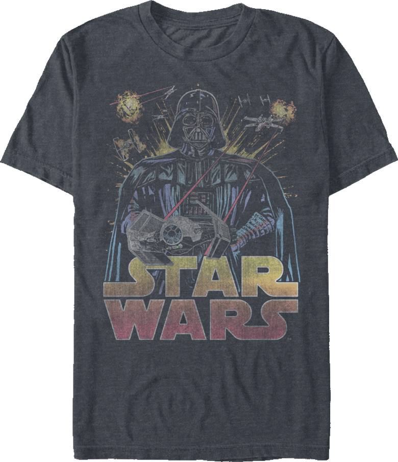This Star Wars Vader Air Battle T-Shirt shows everyone's favorite villain surrounded by a battle between TIE Fighters and X-Wing Fighters above the Star Wars logo. For any fan of the most famous Darth, this Star Wars Vader Air Battle T-Shirt is a must-have!