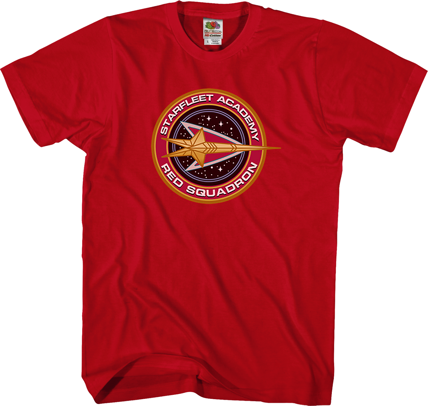 This Star Trek shirt features the logo for Starfleet Academy's Red Squadron. In the Star Trek universe, the Red Squadron is the name given to an exclusive group of cadets training at the Starfleet Academy. These cadets were selected for advance field training and special courses.