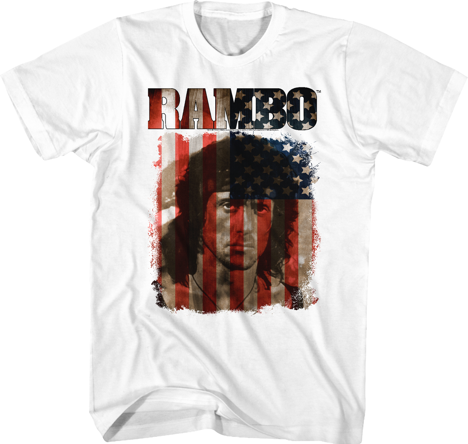 For any fan of the iconic Sylvester Stallone character, this Stars and Stripes Rambo t-shirt is a must have!