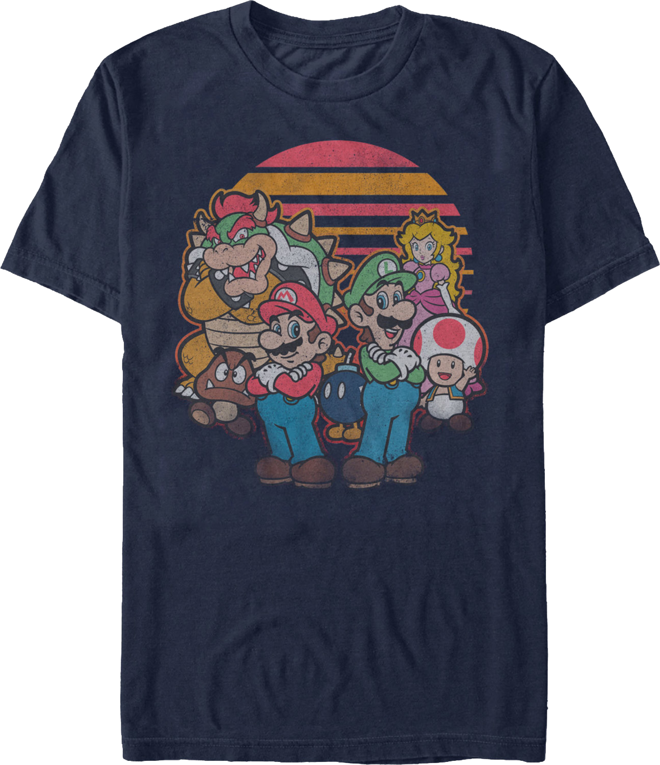 This Super Mario Bros. t-shirt features the stars of the video game. The shirt shows Mario, a Goomba, Bowser, a Bob-omb, Princess Peach, Toad and Luigi.
