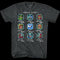 This Mega Man t-shirt features the Start Screen with the following character boxes: Bubble Man, Air Man, Quick Man, Heat Man, Dr. Wily, Wood Man, Metal Man, Flash Man, Crash Man.