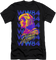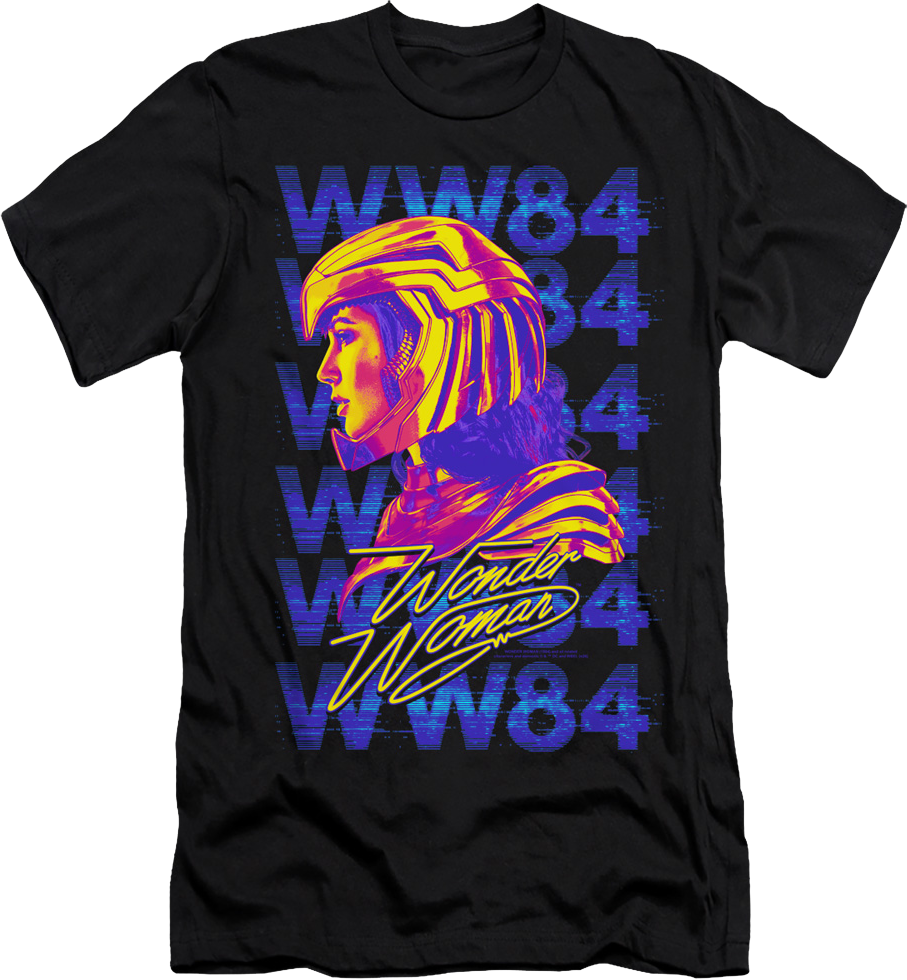 This Wonder Woman t-shirt shows the Amazon warrior princess in her Golden Eagle Armor, posing in front of a repeating WW84 logo that is filled with television static.
