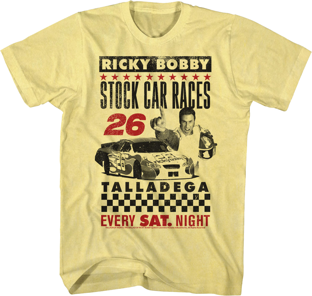 For any fan of the 2006 classic starring Will Ferrell, this Stock Car Races Talladega Nights T-Shirt is a must have!