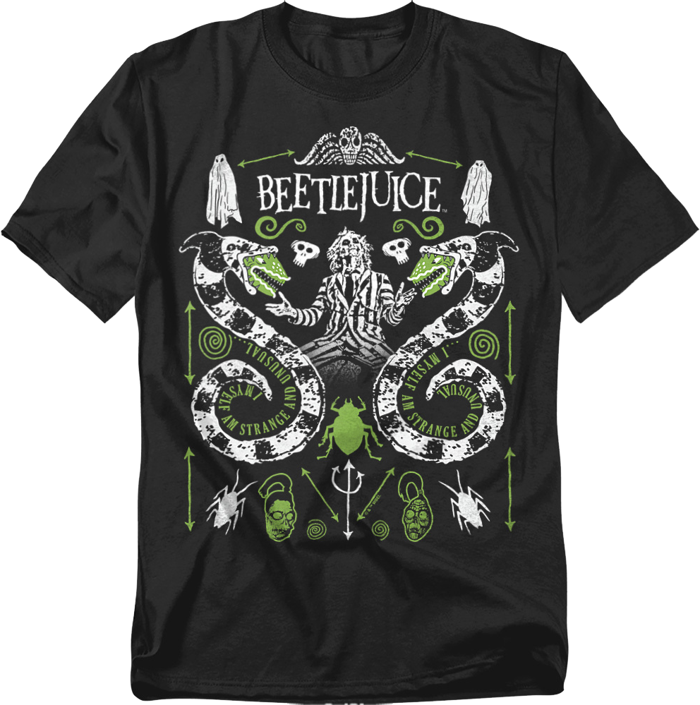 This Beetlejuice t-shirt features icons that include Beetlejuice, Adam and Barbara Maitland dressed as ghosts, skulls, Sandworms, beetles, arrows, and shrunken heads. The shirt includes Lydia Deetz's quote "I myself am strange and unusual..."