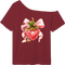 This Strawberry Shortcake off the shoulder shirt shows Strawberry Shortcake holding a strawberry that is wrapped in a bow.