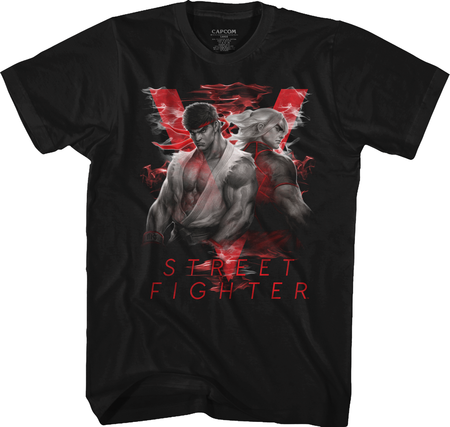 This Street Fighter t-shirt features images of Ryu and Ken Masters from the 2016 Capcom video game Street Fighter V.