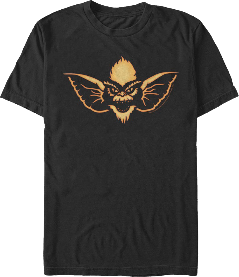 This Gremlins t-shirt features an image of Stripe that has been carved into a Jack-O'-Lantern.