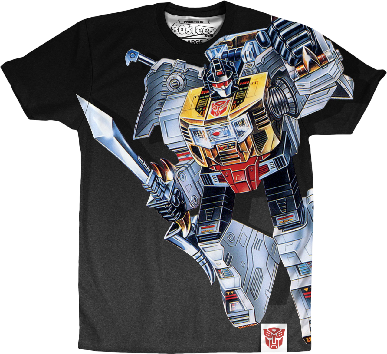 Grimlock is much more than just a mechanical Tyrannosaurus that wants to munch metal. This 80sTees.com exclusive Transformers shirt shows the Grimlock in his intimidating robot mode. Grimlock is seen holding his dangerous Thermal Sword.