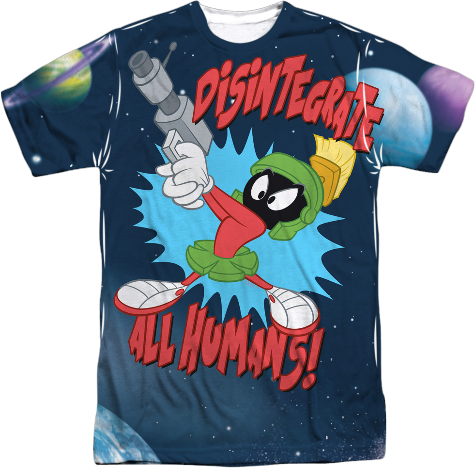 This sublimated Looney Tunes shirt features an image of Marvin the Martian in outer space with his trusty ACME Disintergrating Ray Pistol. The shirt reads Disintegrate All Humans! The back of the shirt shows a close-up image of Marvin in his trademark Martian helmet.