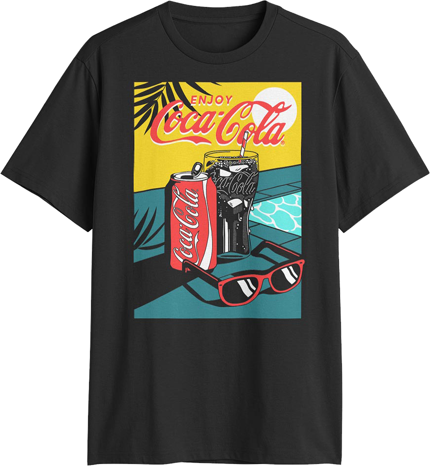This Coca-Cola t-shirt features a poster that shows sunglasses, a Coca-Cola can and a glass of Coke beside a swimming pool on a sunny summer day. The poster reads "Enjoy Coca-Cola."