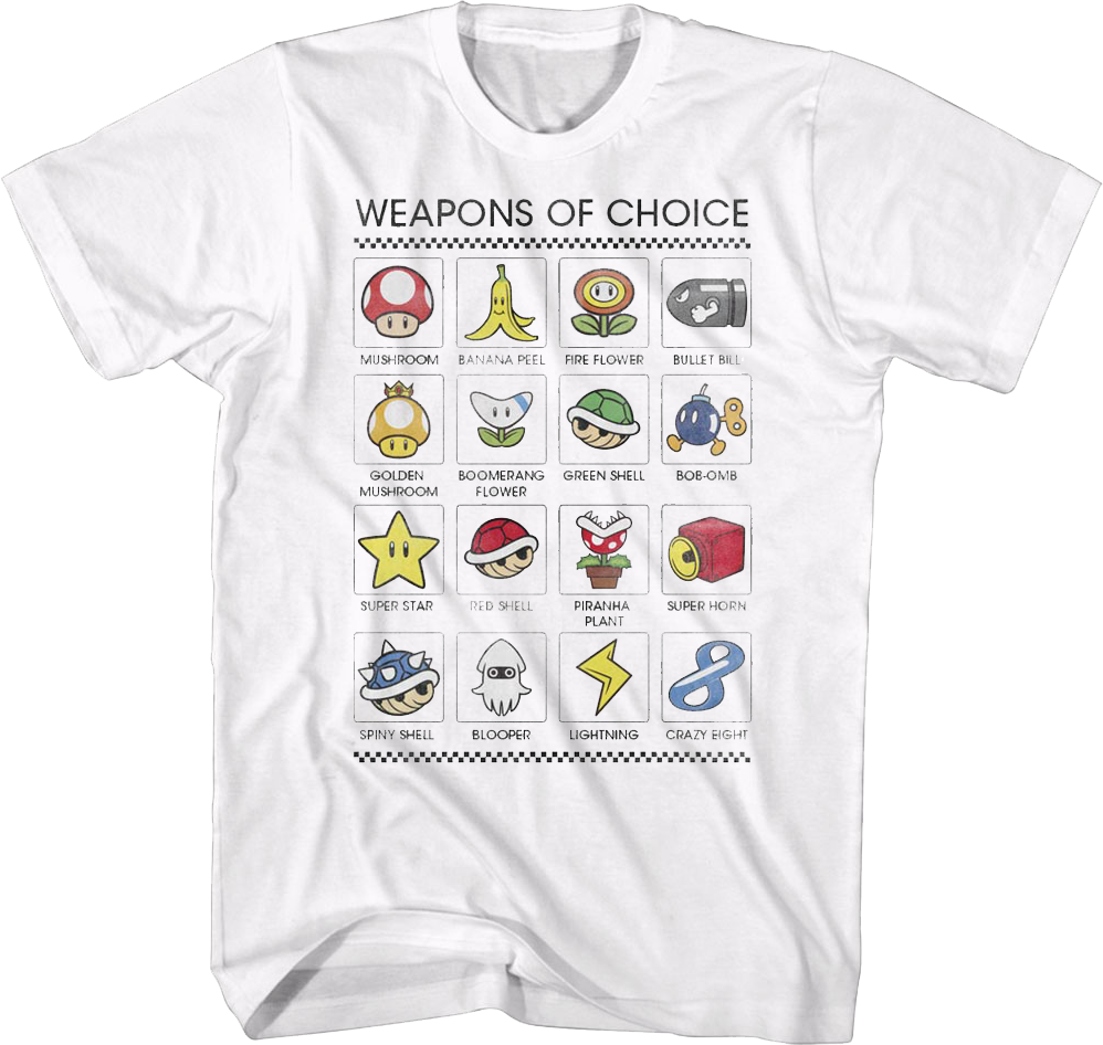 This Super Mario Bros. t-shirt features Power-Ups and the common enemies that Mario faces in his classic video games. The shirt reads Weapons Of Choice.