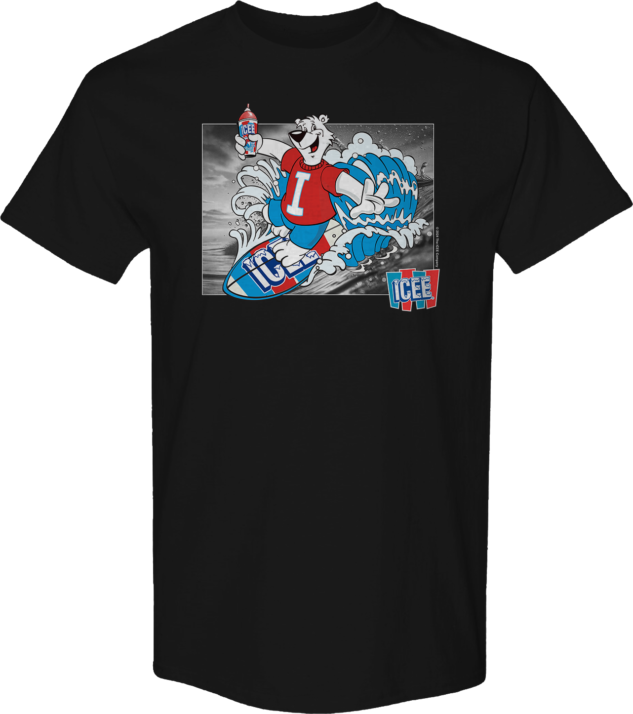 This ICEE t-shirt shows the frozen drink's polar bear mascot surfing on an ICEE surf board.
