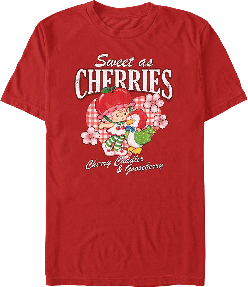 This Strawberry Shortcake t-shirt features an image of Cherry Cuddler with her pet Gooseberry. The shirt reads "Sweet as Cherries."