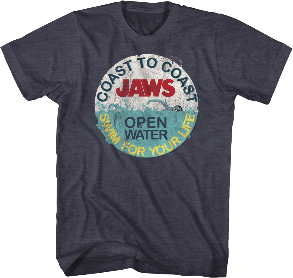 This Swim For Your Life Jaws T-Shirt shows the first victim of the giant shark swimming on an "Open Water" sign. It reads "Coast to Coast" and "Swim for Your Life." Steven Spielberg's 1975 thriller made everyone think twice before skinny dipping in the ocean.