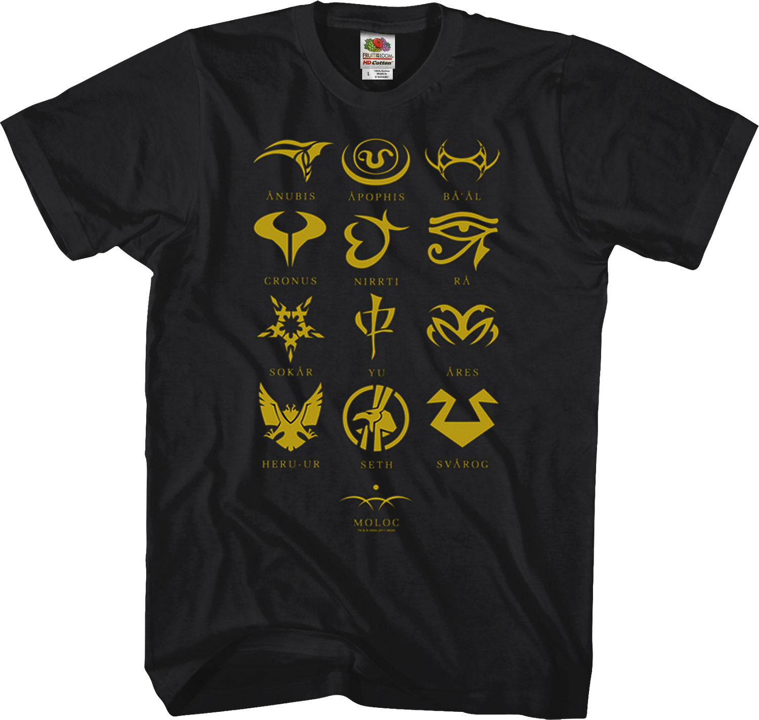 This Symbols Stargate SG-1 T-Shirt shows the symbols for Anubis, Apophis, Ba'al, Cronus, Nirrti, Ra, Sokar, Yu, Ares, Heru-Ur, Seth, Svarog, and Moloc. The television show that was based on the 1994 movie ended up running for ten seasons: the second longest running sci-fi series. The show followed a military team from Earth who ventured to distant planets using an alien portal. In each episode, the team was given exciting missions to explore the galaxy and search for alien technology.