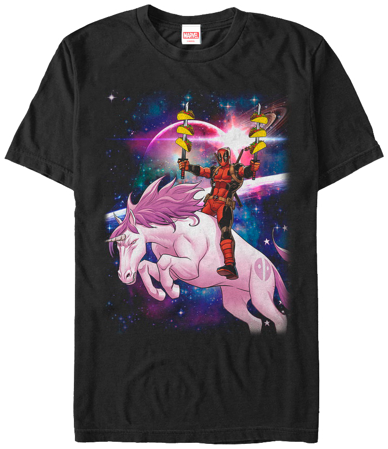 This Tacos On A Unicorn Deadpool T-Shirt shows the Marvel anti-hero flying through the galaxy on a pink unicorn with his twin katanas full of tacos. Life doesn't get much better than this for the Merc with a Mouth. Wade Wilson took part in the Weapon X program, which made him a formidable soldier, but did nothing to diminish his sarcastic personality.
