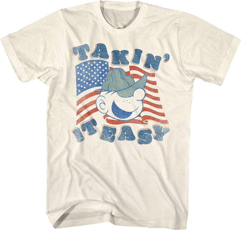 This Beetle Bailey t-shirt shows Army private Bailey's face in front of an American flag. The shirt reads Takin' It Easy.
