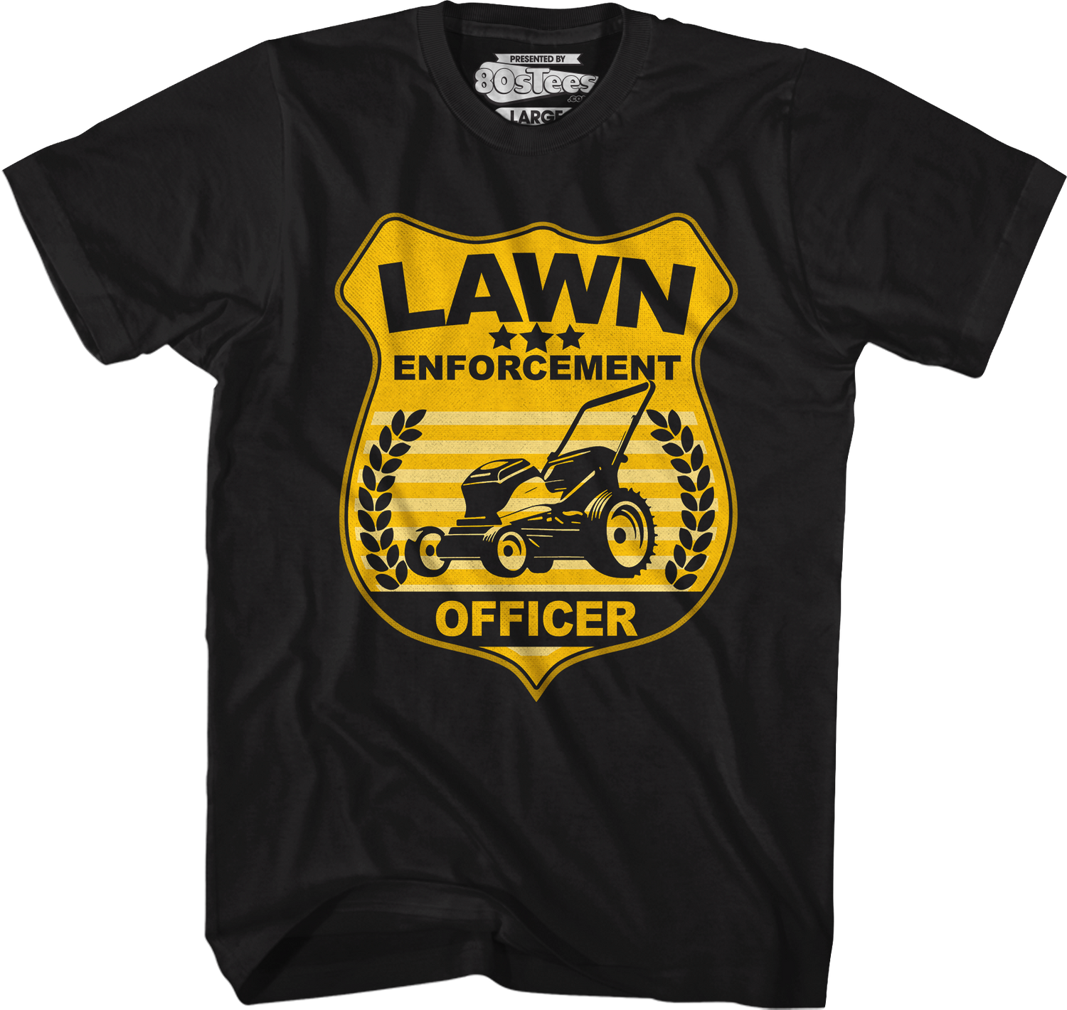 This 80sTees.com exclusive t-shirt shows a lawn mower on a badge that reads "Lawn Enforcement Officer".