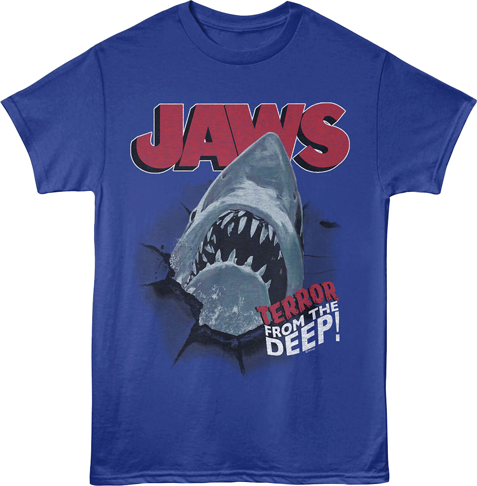 This Jaws t-shirt shows a great white shark breaking through the shirt's fabric. The shirt includes the tagline "Terror From The Deep!"