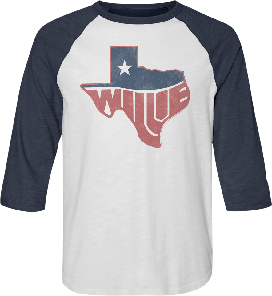 This Willie Nelson raglan baseball shirt shows Willie's name in an outline of the shape of Texas.