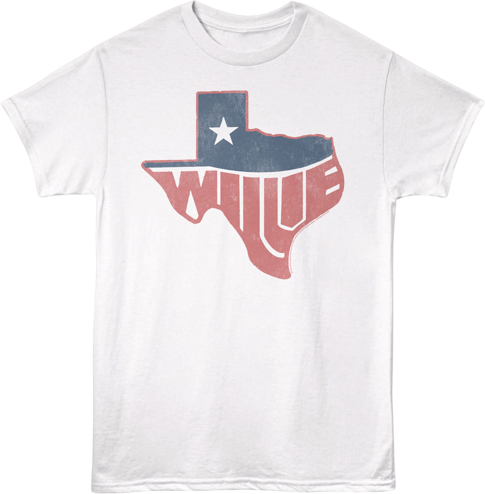 This Willie Nelson t-shirt shows Willie's name in an outline of the shape of Texas.