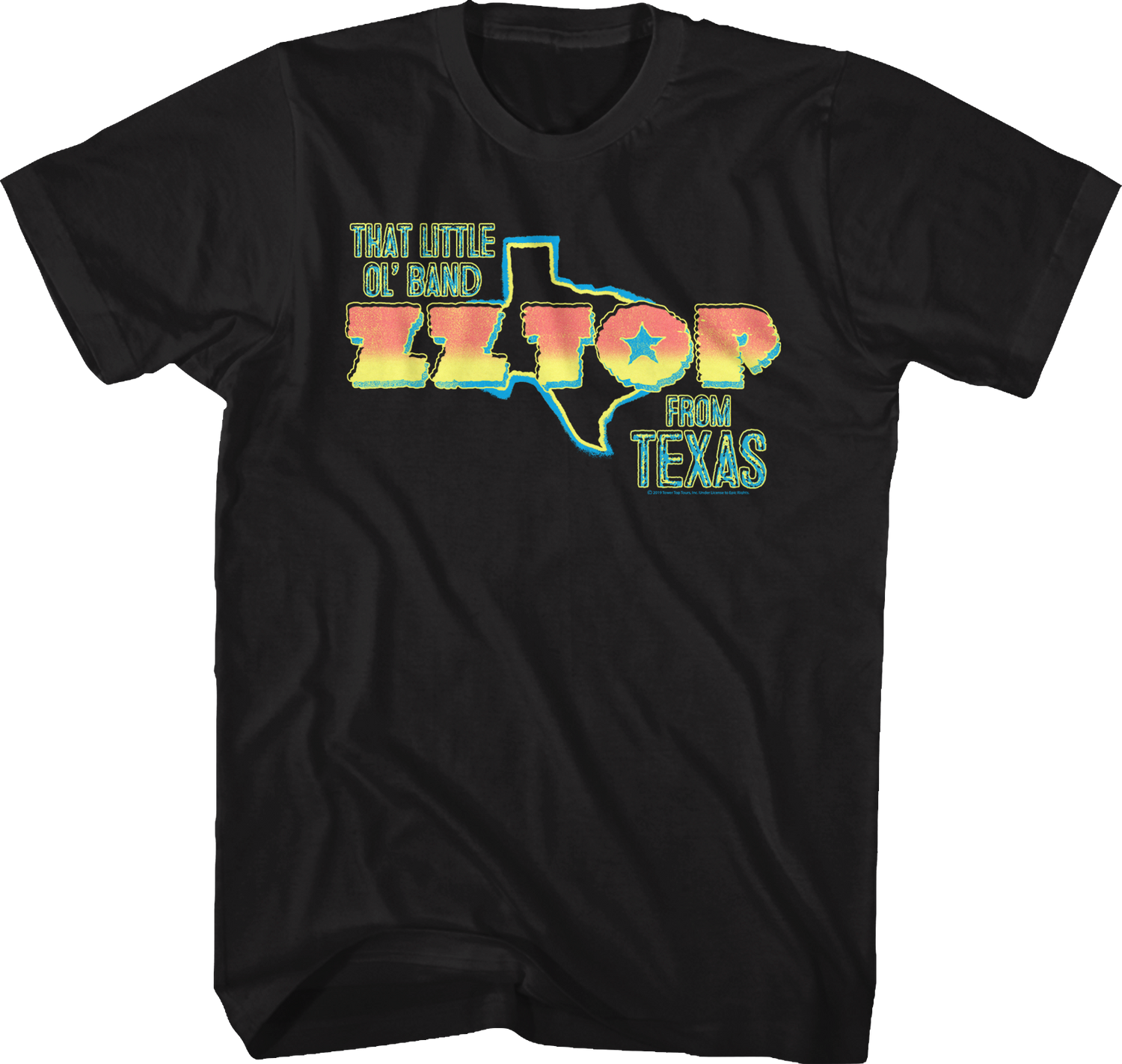 This That Little Ol' Band From Texas ZZ Top T-Shirt features the rock band's name with the outline of their home state. Formed in 1969 in Houston, Texas, this iconic band has written their page in the pages of history with songs like "Legs", "Sharp Dressed Man", and "Cheap Sunglasses".